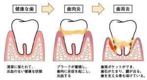 歯茎の腫れだけの段階で治療ができればまだ良いのですが、気づかないまま放置してしまうと歯周病が進行して端の土台となる骨が少しずつ破壊されていきます。人にもよりますが5年から10年かかってじわじわ進み歯がグラグラしてくるのでおかしいなと思うときにはすでに相当に進行した歯周病で歯を抜かないといけないケースが出てきてしまいます。