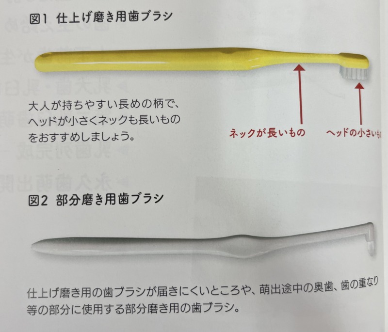仕上げ磨き用は、奥まで届くように、ヘッドが小さめでネックの長いものがおすすめです。その他、届きにくいところや、萌出途中の臼歯、歯の重なり等の部分には、部分磨き用歯ブラシを使用するとよりいいです。両方のタイプを併用することが望ましいのでぜひ使用してみてください!