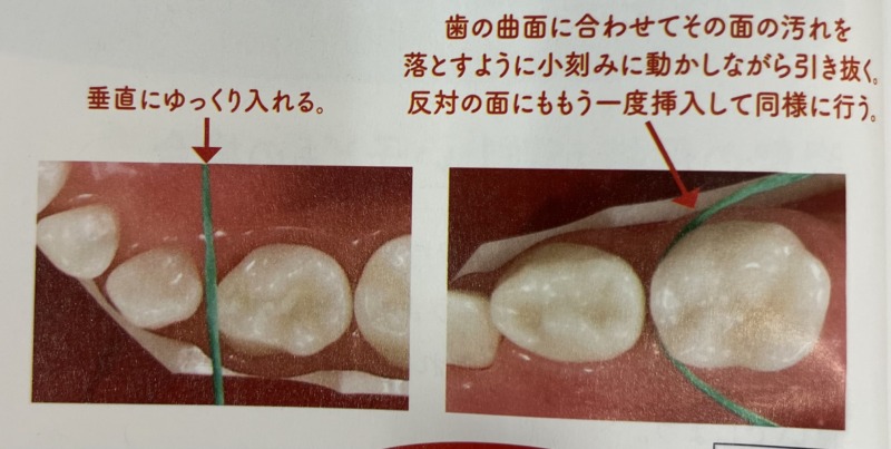 歯は、垂直に萌出しているのではなく曲線のある立体なので、歯の曲面にそうようにゆっくりと歯肉から歯冠方向へフロスを動かしましょう。一ヶ所に2回入れ、両方の面に糸をあてることがポイントです。